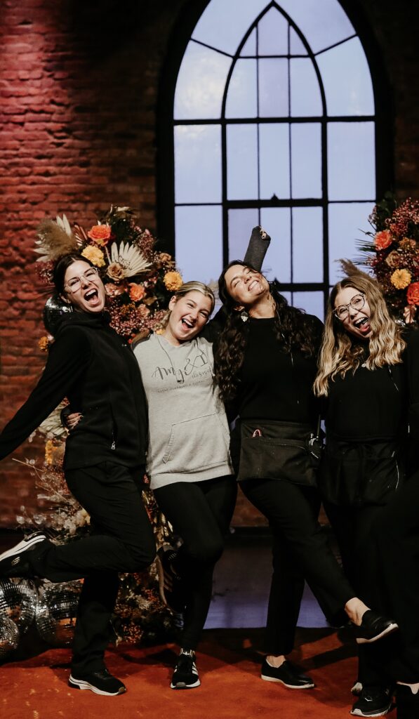 On wedding days, you’ll see us getting our steps in, fluffing bouquets, or dancing behind the scenes to make things run smoothly and we’ll be doing it all with love, intention, and a healthy dose of fun.